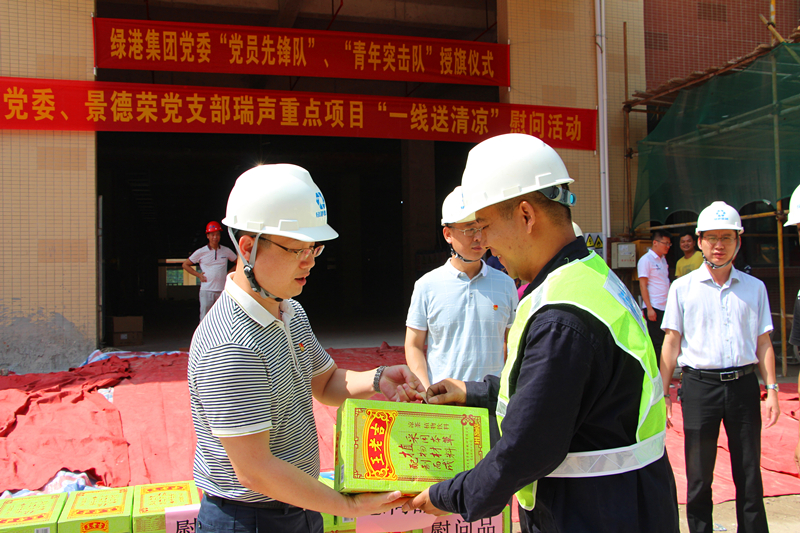 此次活動(dòng)也是綠港集團(tuán)黨委在今年開展“四個(gè)一線”爭(zhēng)先鋒、創(chuàng)建黨建示范品牌工作以來,在項(xiàng)目建設(shè)一線開展創(chuàng)建“黨員攻堅(jiān)先鋒隊(duì)”活動(dòng)的重要舉措之一?!八膫€(gè)一線”是綠港集團(tuán)黨委圍繞經(jīng)開區(qū)黨工委加強(qiáng)基層黨建三年行動(dòng)計(jì)劃,結(jié)合集團(tuán)公司項(xiàng)目建設(shè)、企業(yè)服務(wù)、招商銷售、項(xiàng)目融資的四個(gè)任務(wù),以“抓黨建促發(fā)展,抓品牌促提升”為主題,組織號(hào)召?gòu)V大黨團(tuán)員積極開展在項(xiàng)目一線創(chuàng)建“黨員攻堅(jiān)先鋒隊(duì)”、在服務(wù)企業(yè)一線創(chuàng)建“服務(wù)示范標(biāo)兵(窗口)”、在招商銷售一線創(chuàng)建“一個(gè)黨員一面旗,我為綠港做代言”、在項(xiàng)目融資一線“爭(zhēng)做黨員領(lǐng)頭雁”的活動(dòng)。活動(dòng)開展以來,集團(tuán)黨建真正實(shí)現(xiàn)了“走前頭、作表率”的目標(biāo),引導(dǎo)集團(tuán)公司全體黨員干部轉(zhuǎn)變工作作風(fēng)、提高工作效能、強(qiáng)化服務(wù)意識(shí),在促進(jìn)綠港集團(tuán)樹立國(guó)企黨建標(biāo)桿,不斷提升社會(huì)形象起到引領(lǐng)作用。授旗儀式結(jié)束后,綠港集團(tuán)與會(huì)領(lǐng)導(dǎo)還給項(xiàng)目一線參建人員送上了王老吉、西瓜水果等清涼慰問品,鼓勵(lì)他們繼續(xù)發(fā)揚(yáng)綠港鐵軍精神,急難險(xiǎn)重顯身手,同時(shí)要注意防暑降溫、保重身體,更好地為項(xiàng)目建設(shè)做貢獻(xiàn)。(綠港集團(tuán) 陽正輝、張彩秀/文、圖)
