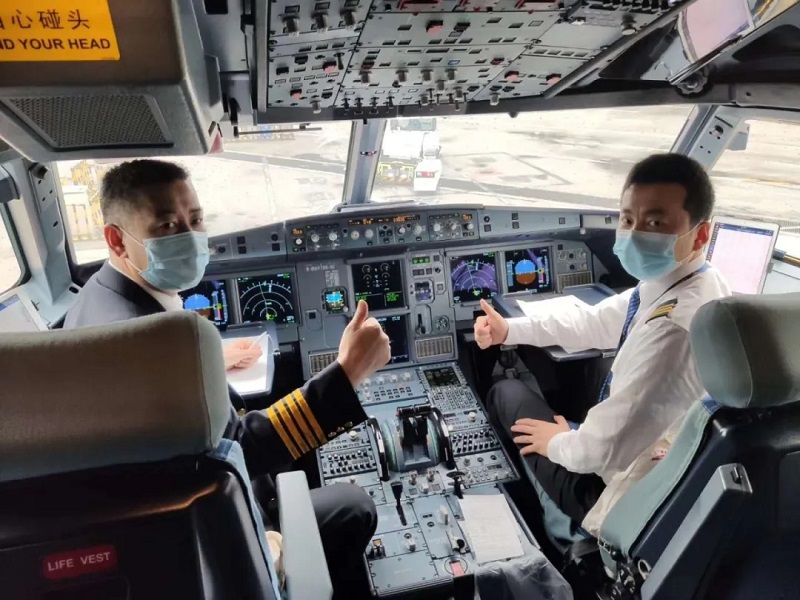 醫(yī)療隊(duì)員和飛機(jī)乘務(wù)人員合影留念。