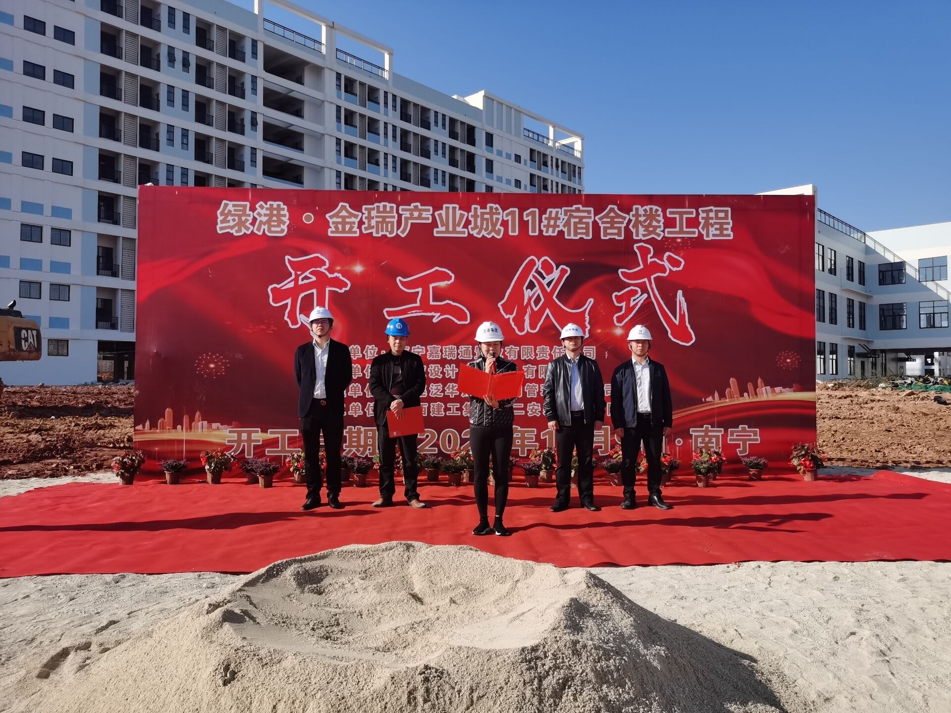 綠港·金瑞產(chǎn)業(yè)城項目位于南寧經(jīng)開區(qū)高嶺路南側(cè)、金陽路西側(cè),占地245畝,總建筑面積406039.74㎡,總投資約13億元。項目包括17個單體建筑,分三期建設(shè),一期約6.1萬㎡;二期約14.8萬㎡;三期約19.7萬㎡。目前,項目一、二期工程正如火如荼建設(shè)中,一期工程除16#污水處理廠房外,其他全部單體已拆除外架,計劃于2021年12月完工;二期工程全部單體將于11月完成主體封頂,計劃在2022年1月完工。本次開工建設(shè)的11#宿舍樓工程擬建設(shè)1棟9層宿舍樓及其他附屬配套設(shè)施,建筑面積18129.06㎡,計劃于2022年10月交付。