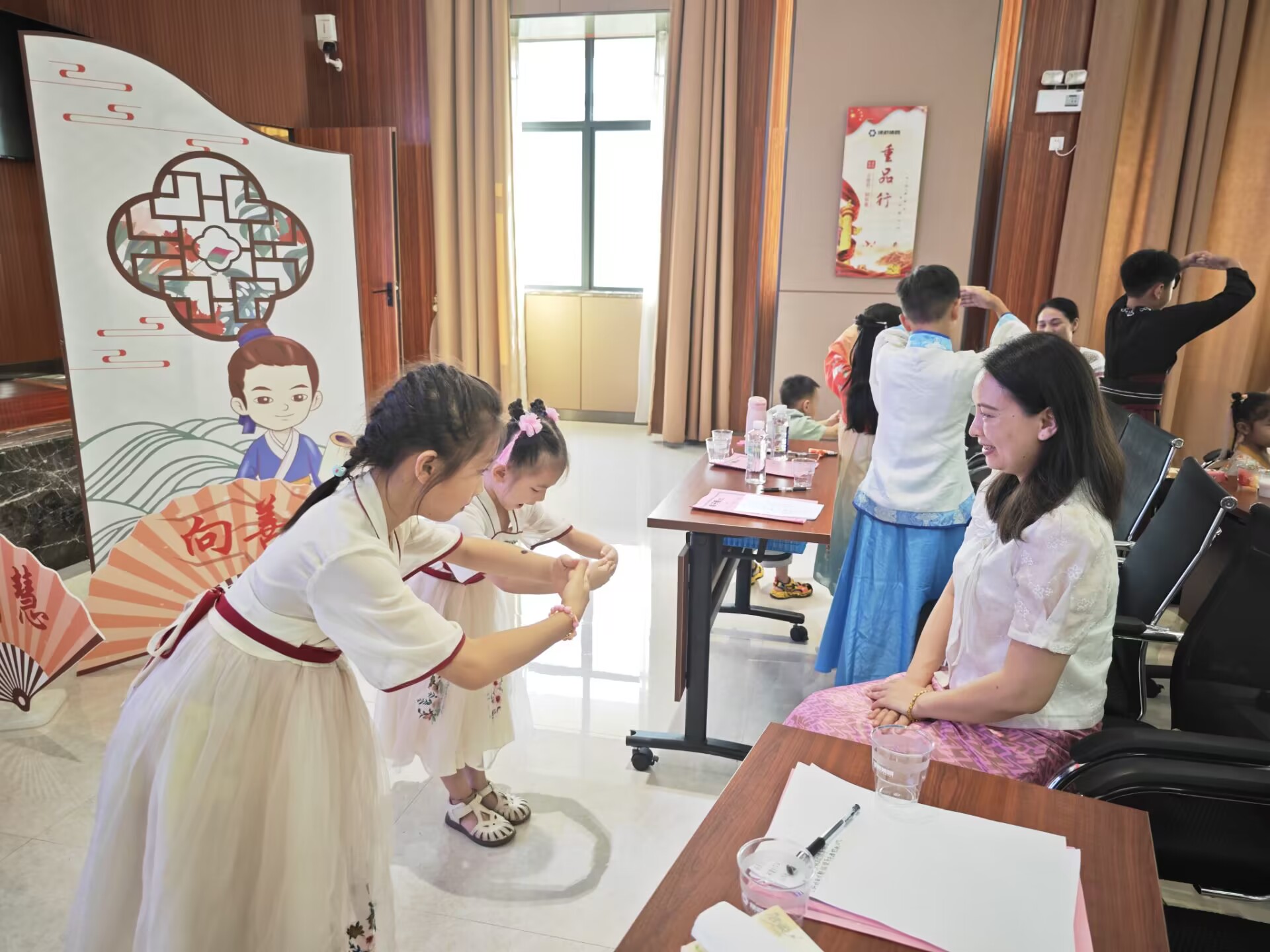 活動以傳統(tǒng)禮儀的學(xué)習(xí)和體驗為主題,此次培訓(xùn)邀請了廣西經(jīng)貿(mào)職業(yè)技術(shù)學(xué)院智慧商務(wù)產(chǎn)業(yè)學(xué)院的老師韋斯斯講授少兒禮儀知識。活動中,韋老師向孩子們講解了《弟子規(guī)》中學(xué)習(xí)的重要、做人的道理以及待人接物的禮貌常識,讓大家更好地理解傳統(tǒng)的禮儀。韋老師親身示范,教授大家如何正確行認知禮儀、家庭禮儀、餐桌禮儀、待客禮儀、交往禮儀、入泮禮、作揖禮、孝道禮儀等,在抬手躬身中感受禮儀之邦的古韻,學(xué)習(xí)尊師重教的品德。韋老師結(jié)合理論知識學(xué)習(xí),邀請孩子們上臺實操演練,模擬情景表演、開展親子互動小游戲等,孩子們紛紛上臺,為大家展示,將學(xué)到的文明禮儀知識落實到行動中,培訓(xùn)現(xiàn)場生動形象、氣氛熱烈,孩子們?nèi)褙炞⒙犎±蠋煹闹v解,依照老師的示范,認真的學(xué)習(xí)禮儀,體驗傳統(tǒng)禮儀。
