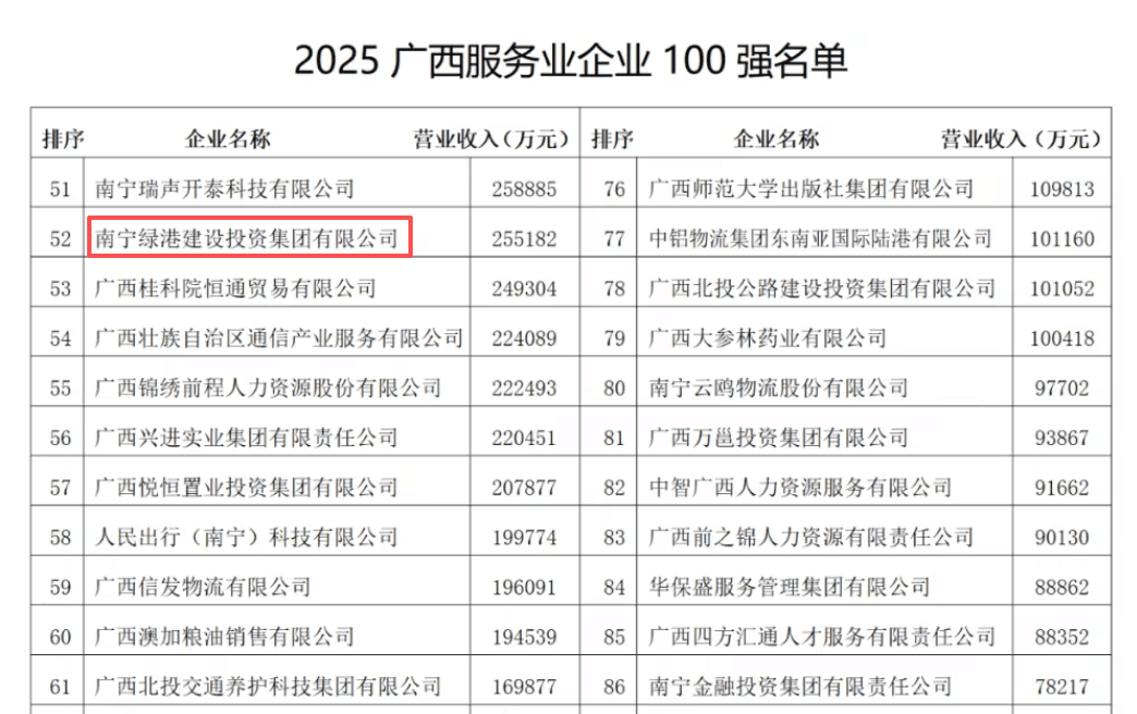 近日,廣西企業(yè)與企業(yè)家聯(lián)合會、廣西工業(yè)經(jīng)濟聯(lián)合會聯(lián)合發(fā)布“2025廣西服務業(yè)企業(yè)100強”榜單。南寧五象經(jīng)投集團下屬企業(yè)綠港集團憑借穩(wěn)健的綜合實力、突出的發(fā)展成效,第4次榮登該榜單并位列第52位,彰顯了公司在服務區(qū)域發(fā)展、推動產業(yè)升級中的堅實底氣與強勁動能。